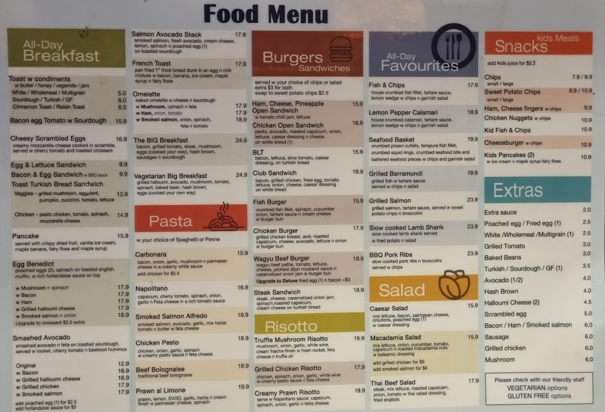 - Seafood Lovers can relish options like Grilled Salmon and Seafood Basket, with prices ranging from A$17.90 to A$23.90.
